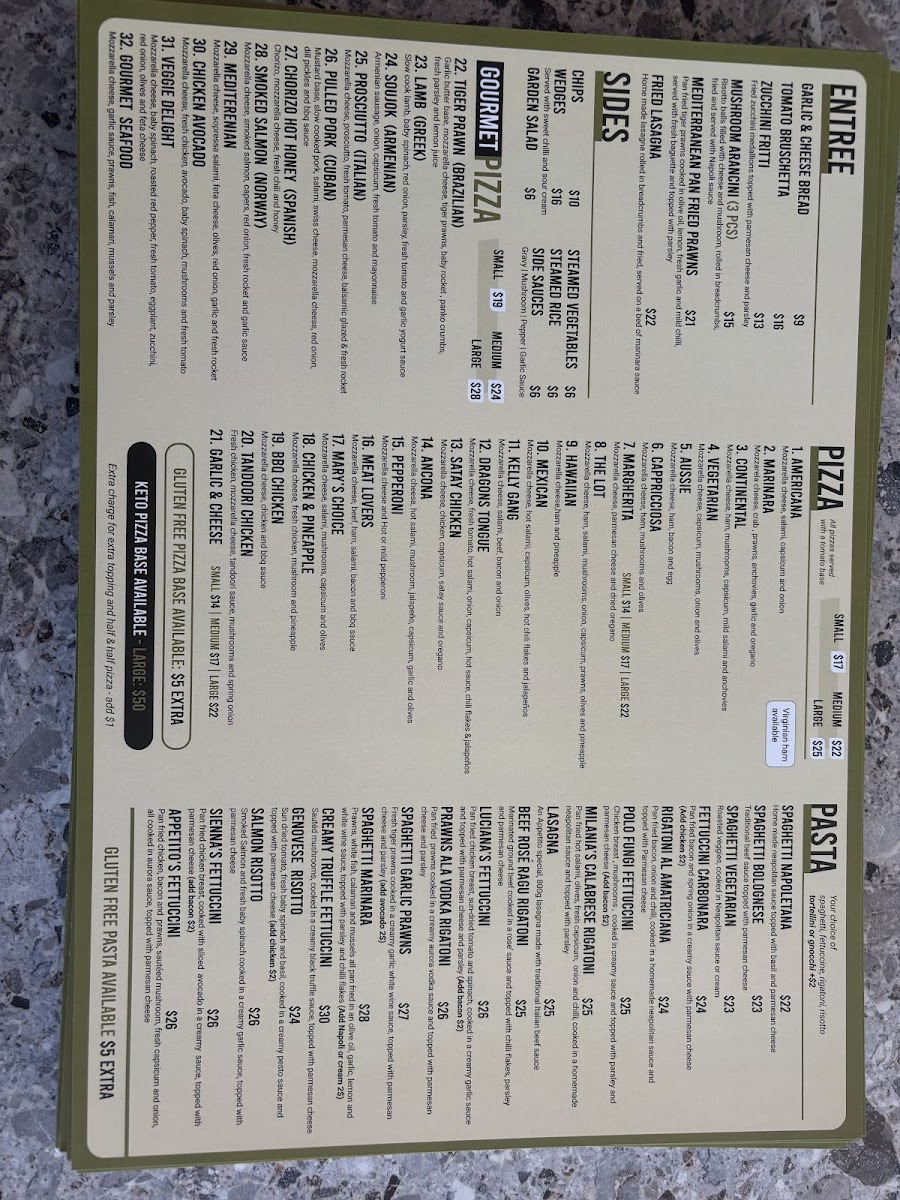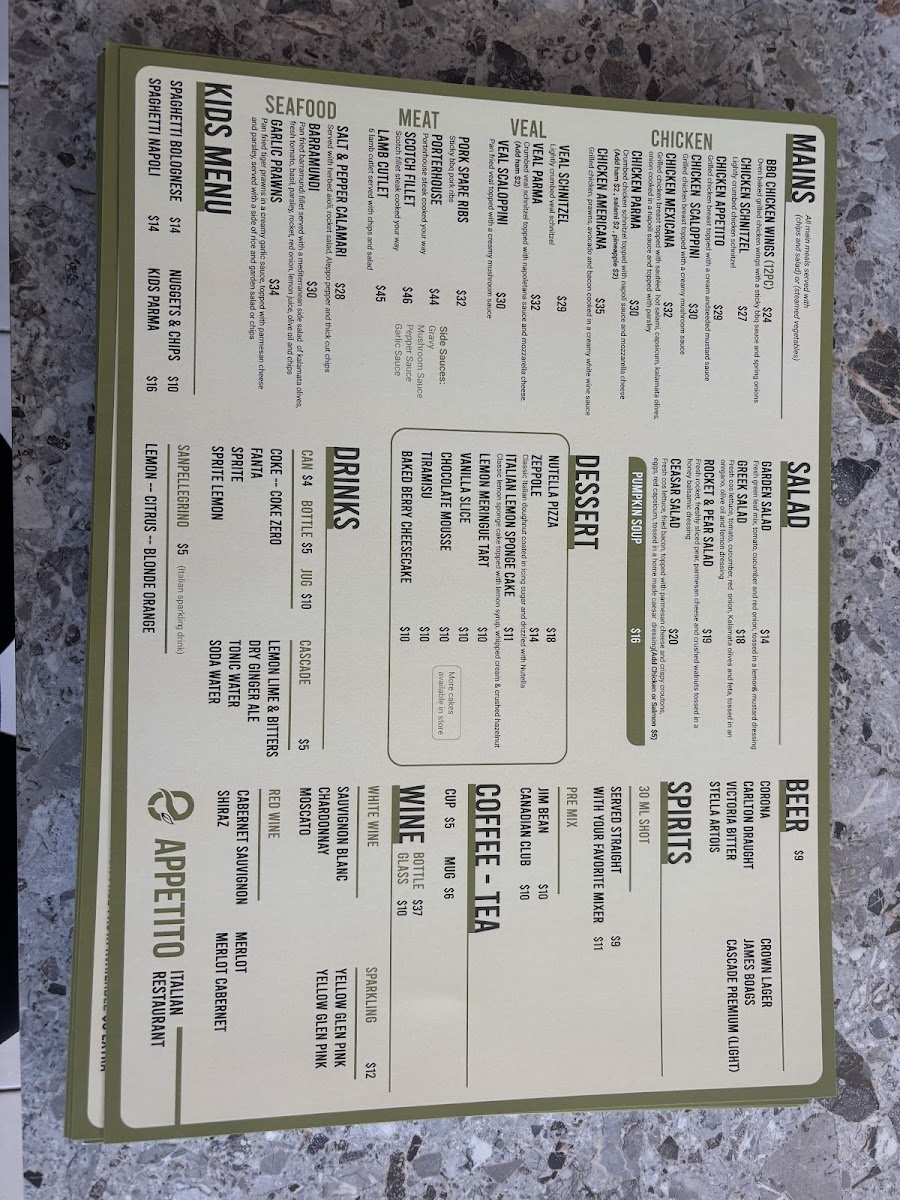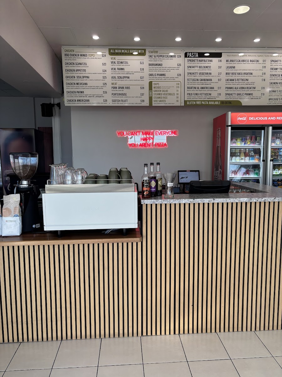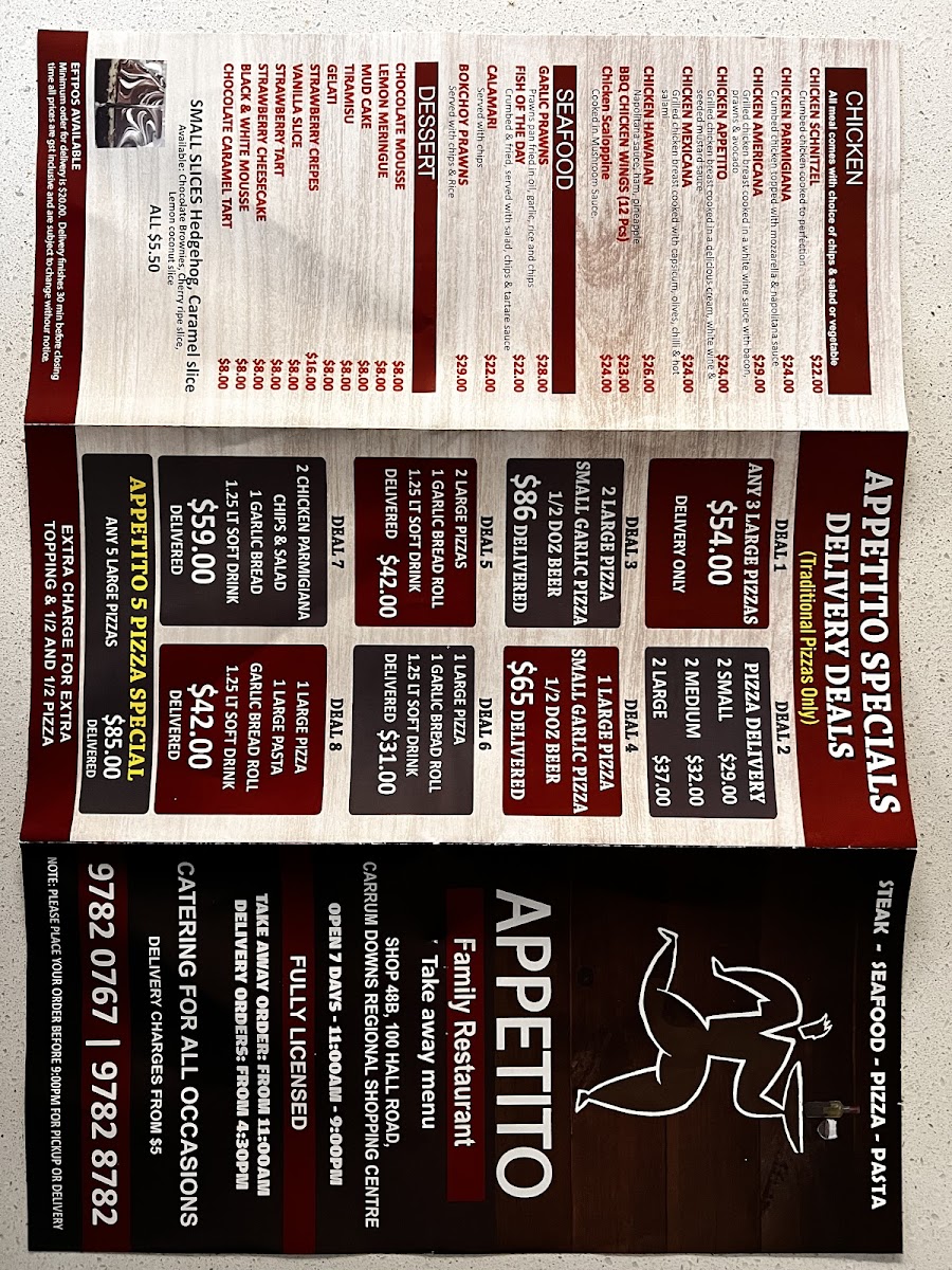 From a reviewer’s perspective, the menu at Appetito Pizza & Pasta offers a well-rounded and satisfying snapshot of classic Italian-Australian dining, bringing together comfort, variety, and family-friendly appeal. The pizza selection alone is impressive, ranging from Traditional Pizzas such as Capricciosa Pizza, Continental Pizza, Meat Lovers Pizza, Garlic And Cheese Pizza, and BBQ Chicken Pizza, to more elevated options in the Gourmet Pizza range like Gourmet Seafood Pizza, Pulled Pork Pizza, Prosciutto Pizza, Soujouk Pizza, and Veggie Delight Pizza, ensuring there is something for both purists and adventurous eaters. Pasta lovers are equally well catered for with hearty, familiar dishes including Sienna's Fettuccini, Fettuccine Carbonara, Luciana's Fettuccini, Melania's Calabrese Rigatoni, and Spaghetti Vegetarian, which reflect a balance of creamy, rich, and lighter vegetarian choices. To start, the Entrées such as Fried Lasagna, Mushroom Arancini, Zucchini Fritti, Mediterranean Pan Fried Prawns, and Garlic Bread set the tone for a generous and flavour-driven meal. The Mains section expands beyond Italian staples with crowd-pleasers like Porterhouse, Veal Parma, Barramundi, BBQ Chicken Wings, and Chicken Parma, appealing to diners looking for classic pub-style favourites. For groups and families, the Deals including Deal One, Deal Two, Deal Three, Deal Four, and Deal Six add value and convenience, while the Kids Menu featuring Nuggets And Chips, Kids Parma And Chips, Spaghetti Napoli, and Spaghetti Bolognese ensures younger diners are well looked after. The menu is rounded out with fresh Salads such as Caesar Salad, Greek Salad, Garden Salad, and Rocket And Pear Salad, alongside versatile Sides like Wedges, Steamed Vegetables, Steamed Rice, and Chips. To finish on a sweet note, Desserts including Tiramisu, Nutella Pizza, Baked Berry Cheesecake, Chocolate Mousse, and Lemon Meringue Tart provide a satisfying conclusion, complemented by simple, refreshing Drinks such as Pineapple, Orange, 600 Ml, Kids Juice Apple, and Strawberry Lemon. Overall, the menu feels thoughtfully curated, approachable, and ideal for casual dining, making Appetito Pizza & Pasta a reliable choice for a relaxed and enjoyable meal in Carrum Downs.